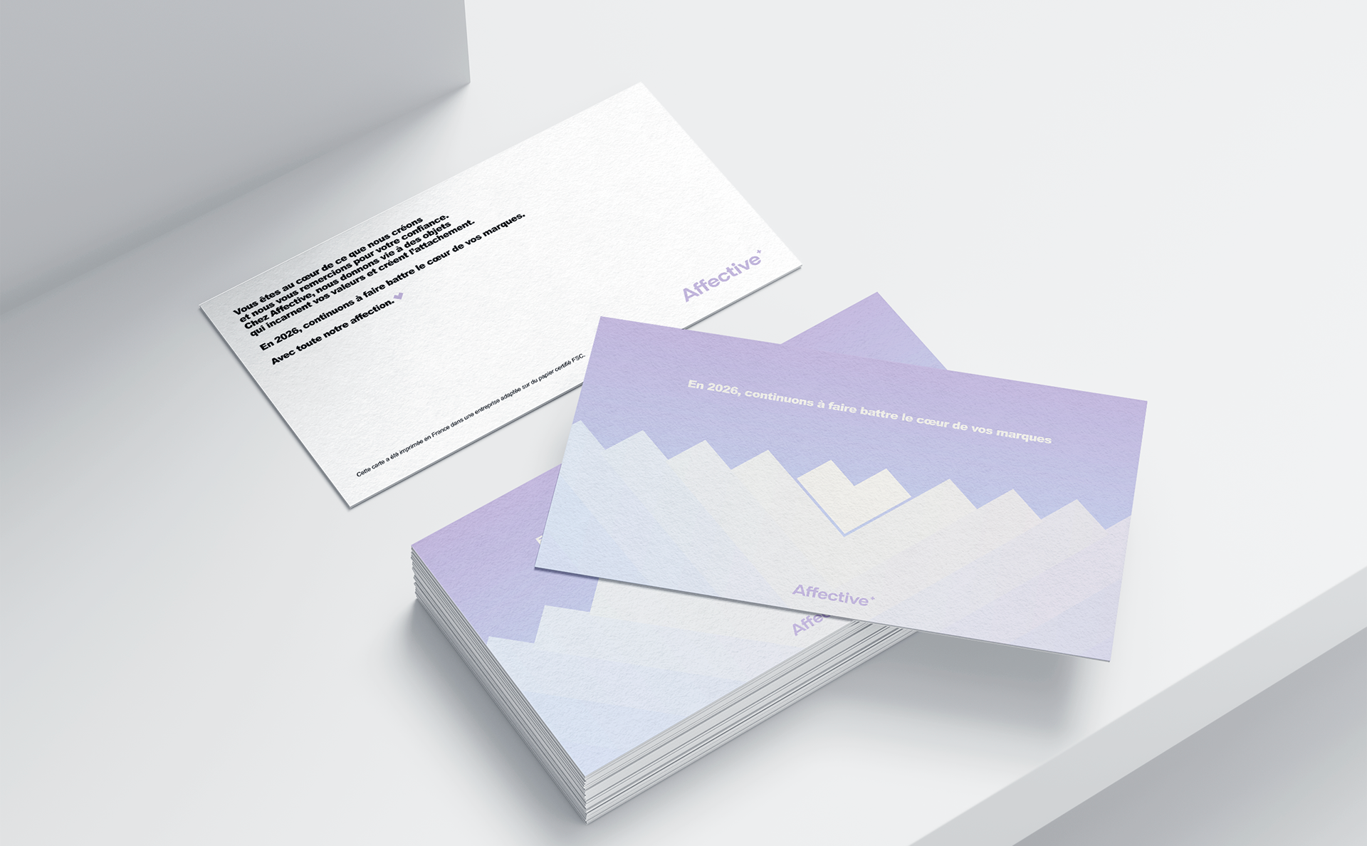 Création de la carte de vœux 2026 de l’agence Affective, en print et digital. Un cœur battant symbolise l’affection et le lien sincère, s’élevant pour célébrer clients et objectifs de 2026.